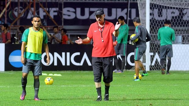 Alfred Riedl memimpin latihan Timnas Indonesia jelang final Piala AFF 2016. (ANTARAFOTO/Yulius Satria Wijaya) |