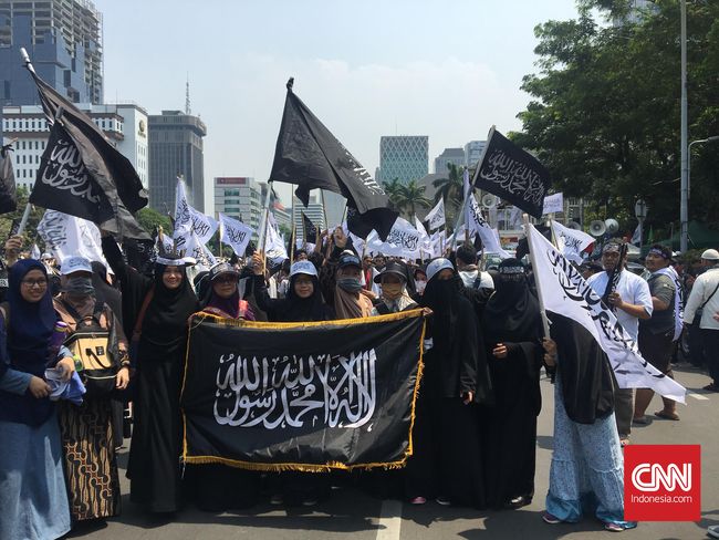 Massa yang diperkirakan berjumlah seribu lebih, juga mengibarkan bendera kalimat tauhid, dan beberapa kali menyerukan takbir. Sejumlah peserta aksi juga membawa anak-anak kecil.