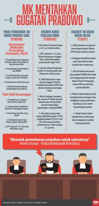 "Amar putusan mengadili, menyatakan dalam eksepsi, menolak eksepsi termohon dan pihak terkait untuk seluruhnya. Dalam pokok permohonan, menolak permohonan pemohon untuk seluruhnya," demikian putusan MK yang dibacakan Anwar dalam sidang di Gedung MK, Jakarta, Kamis (27/6).