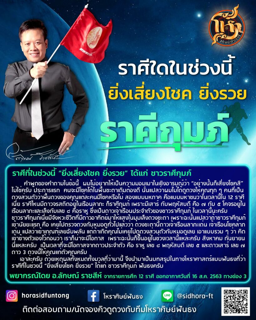 เพจโหราศิษย์ฟันธง ได้โพสต์ภาพและข้อความจากคำทำนายของ หมอลักษณ์ ฟันธง หรือ อ.ลักษณ์ ราชสีห์ ฟันธง ว่า “ศึก 12 ราศี สัปดาห์นี้ ราศีที่ในช่วงนี้ ยิ่งเสี่ยงโชค ยิ่งรวย อ.ลักษณ์ ราชสีห์ ฟันธง ราศีกุมภ์ค่ะ ไหนๆ วันนี้ใครมีโชค รายงานตัวหน่อยค่า เลข 8 นำโชคของราศีกุมภ์จริงๆ ค่ะ”