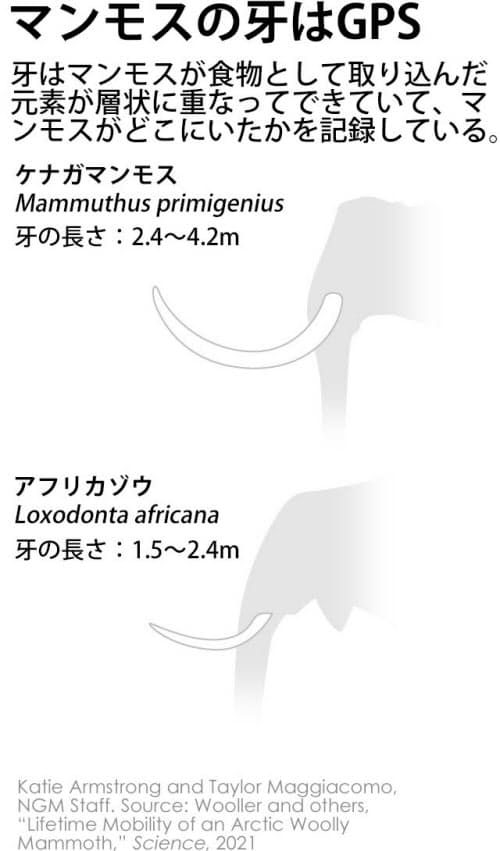 マンモスはその土地の植物を食べながら移動し、各地のストロンチウムが整然と牙に蓄積するため、牙の各部分のストロンチウム同位体比には、マンモスの旅路が正確に記録されていることになる。そのため牙は「化学的なGPS(全地球測位システム)のようです」とウラー氏は言う。