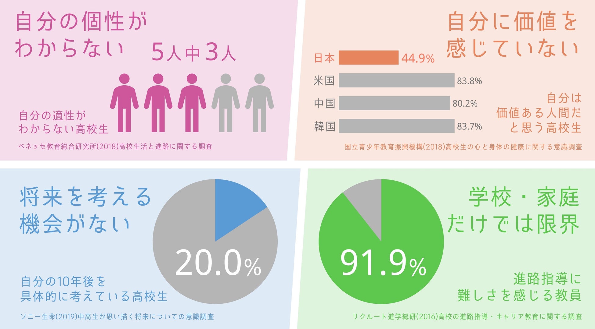 しかしながら、私たちがこれまでに3000人以上の学生と接してきた過程の中で見えてきた現実、それは「自分のやりたいことがわからない」という声があまりにも多いことでした。実際に、以下のような実態があります。