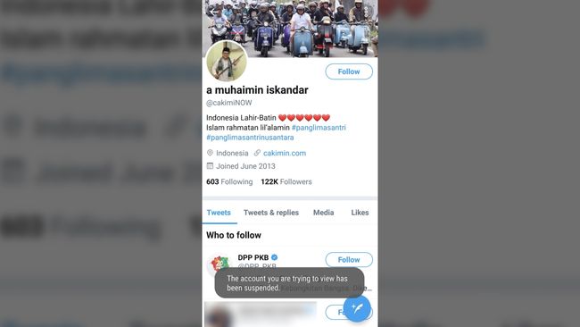 Jakarta, CNN Indonesia -- Akun pribadi milik Ketua Partai Kebangkitan Bangsa (PKB) Muhaimin Iskandar atau Cak Imin dibekukan oleh Twitter.Saat diakses oleh CNNIndonesia.com pada pukul 14.00, akun milik Cak Imin dengan nama pengguna @cakiminNOW itu sudah dibekukan.