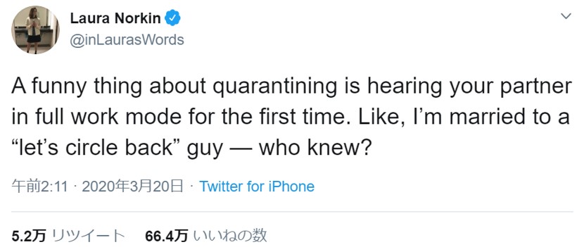 話題となっているのが、「隔離生活で面白いことって、仕事モードに入っているパートナーを初めて見れるってこと。私はね、“後ほど連絡します”男と結婚してたのよ。私だって知らなかったわよ」というツイート。