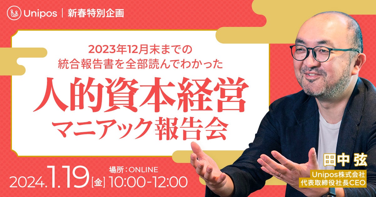 カルチャーを変え、人と組織の力を引き出すwebサービス「Unipos」を提供するUnipos株式会社(本社:東京都渋谷区)は、様々なメディアで発信を行う当社代表・田中弦による「人的資本経営マニアック報告会シリーズ」新春特別ウェビナーを2024年1月19日(金)に開催します。2023年12月末までに発表される統合報告書をすべて読み、最新事例から最速で日本の人的資本経営の動向を分析し、独自の見解をアップデートしてお伝えする企画です。ぜひご参加ください!